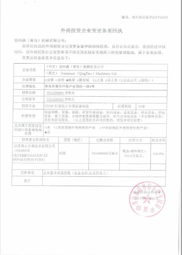 外商投資企業(yè)變更回執(zhí)